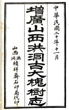 民国三年,曾任山东县令的洪洞人景大启联合当地士绅贺柏寿等倡修大槐树迁民遗址和编撰《古大槐树志》。他们“创建碑亭,建立巨坊,新构茶室”,初步形成了迁民遗址的雏形。与此同时,他们还纂修了《洪洞古大槐树志》,排印百余本行世。1931年,柴汝珍又在旧志基础上重新编辑,汇为《增广洪洞古大槐树志》一书。