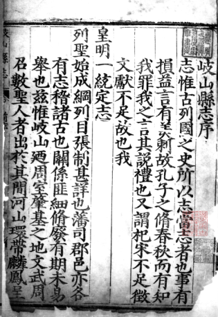 明万历十九年《岐山县志》。于邦栋重修。分为2册,共6卷。设舆地、风土、建置、赋役、祠祀、职官、人物、艺文八志。附岐山县、县城、县治及儒学、文庙、周三王庙、岐山八景等图17幅。于邦栋,山西临汾举人,万历十七年(1589)任岐山知县。