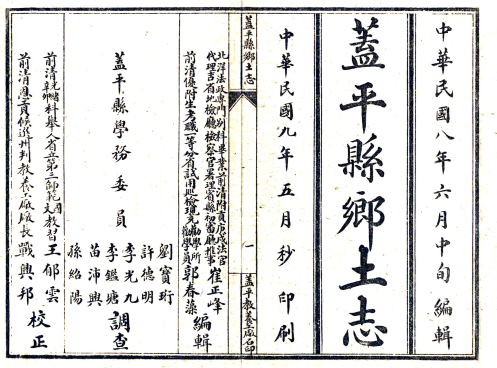 书名:平县乡土志2卷.由盖平县知县章运熺监修,崔正峰、郭春藻编辑,并由王郁云、战兴邦校正。于1919年6月编辑,1920年5月完稿,由盖平教养工厂石印。本志有序五篇,跋文二篇。设治沿革(附表及县城图)、政绩录、兵事录、名宦录(忠义附)、耆旧录、孝义录、节烈录、人类、户口(附表)、田赋(附表)、杂税(附表)、风俗、氏族、宗教、方技、实业、商政、工政、学务(学校附)、警务、农务(农会附)、商务(商会及输出输入岁额表附)、矿务、县境(图附)、区界(附表及自治学校区界)、市镇、公所、桥梁(渡船附)、祠祀庙宇(附名宦忠孝节义祠)、古迹、古墓、山脉、河流、道路、物产、盐滩、渔业、山剪篇目。